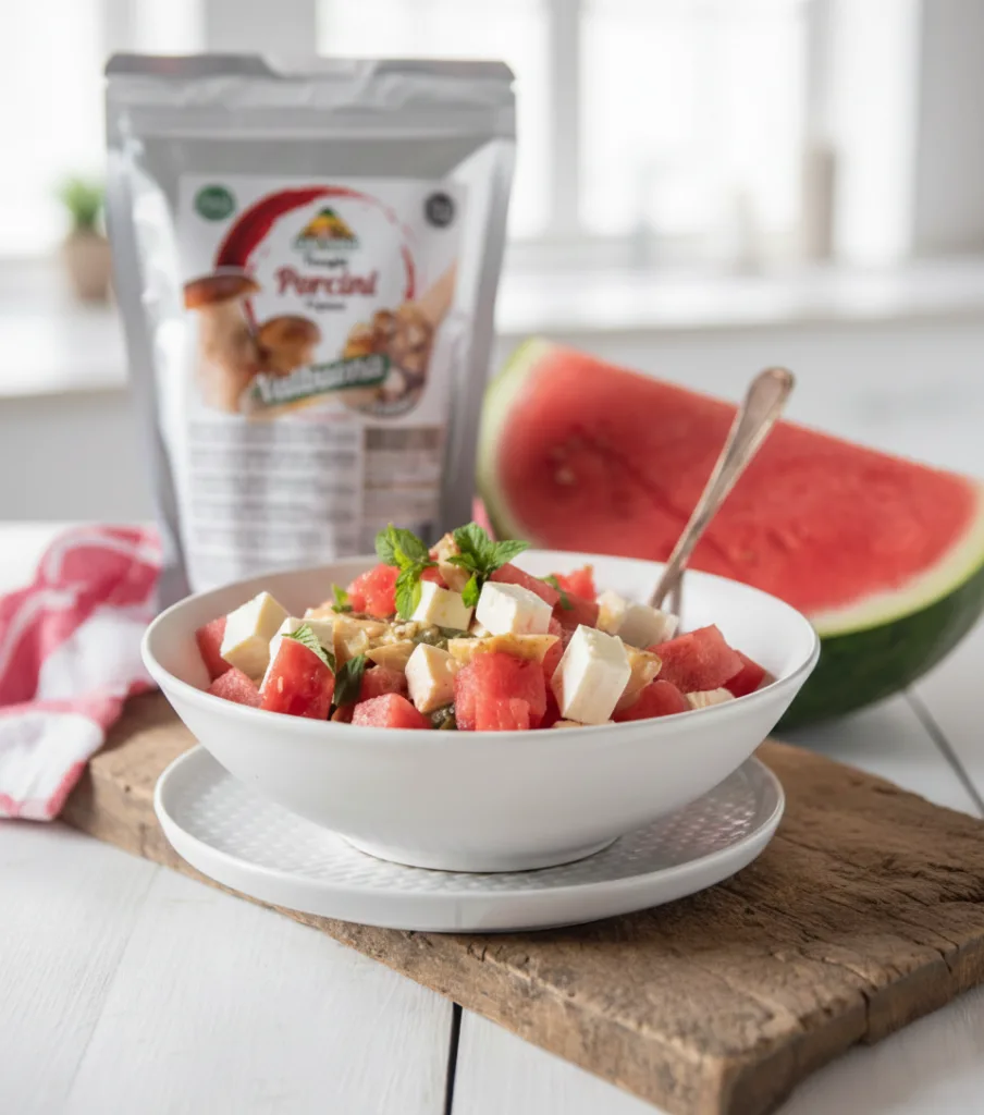 - In una ciotola capiente mettere i cubetti di anguria, i cubetti di feta, i fagiolini e aggiungere i funghi porcini trifolati con il loro olio.